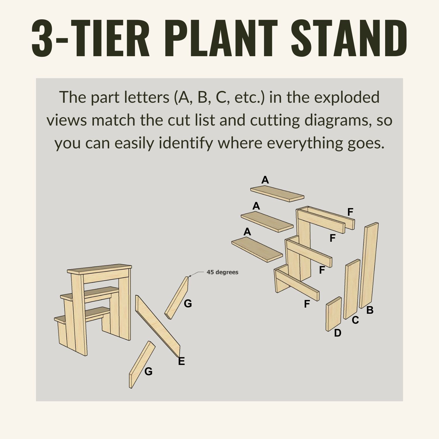 The part letters (A, B, C, etc.) in the exploded views match the cut list and cutting diagrams, so you can easily identify where everything goes.