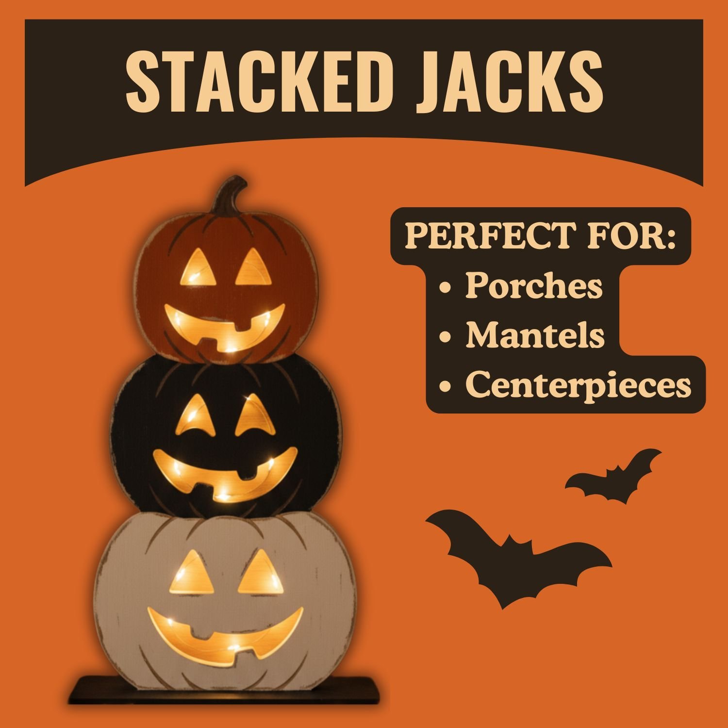 The finished Stacked Jacks measure about 9" high (plus the thickness of your base) — the perfect size for a porch, mantel, or tablescape.