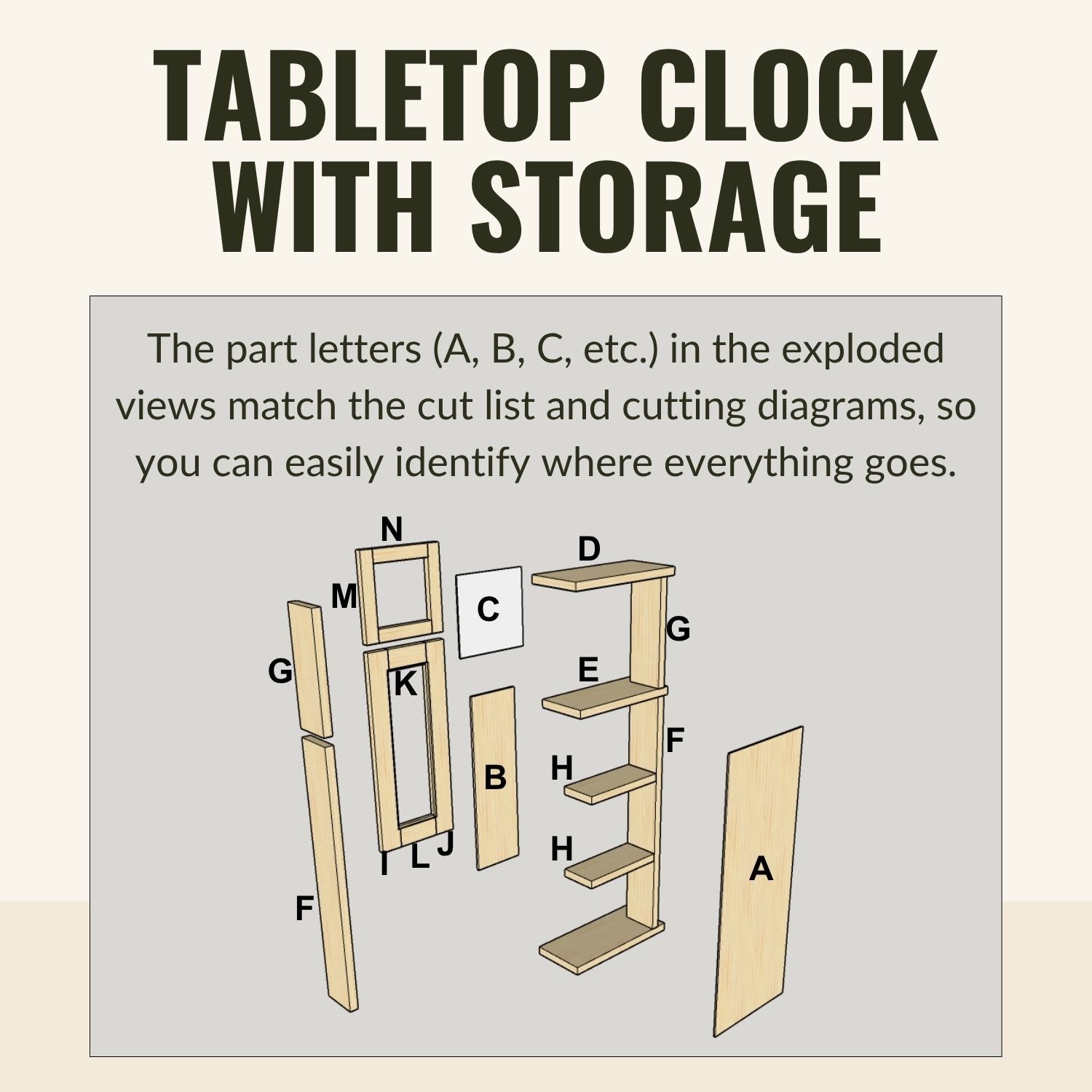 The part letters (A, B, C, etc.) in the exploded views match the cut list and cutting diagrams, so you can easily identify where everything goes.